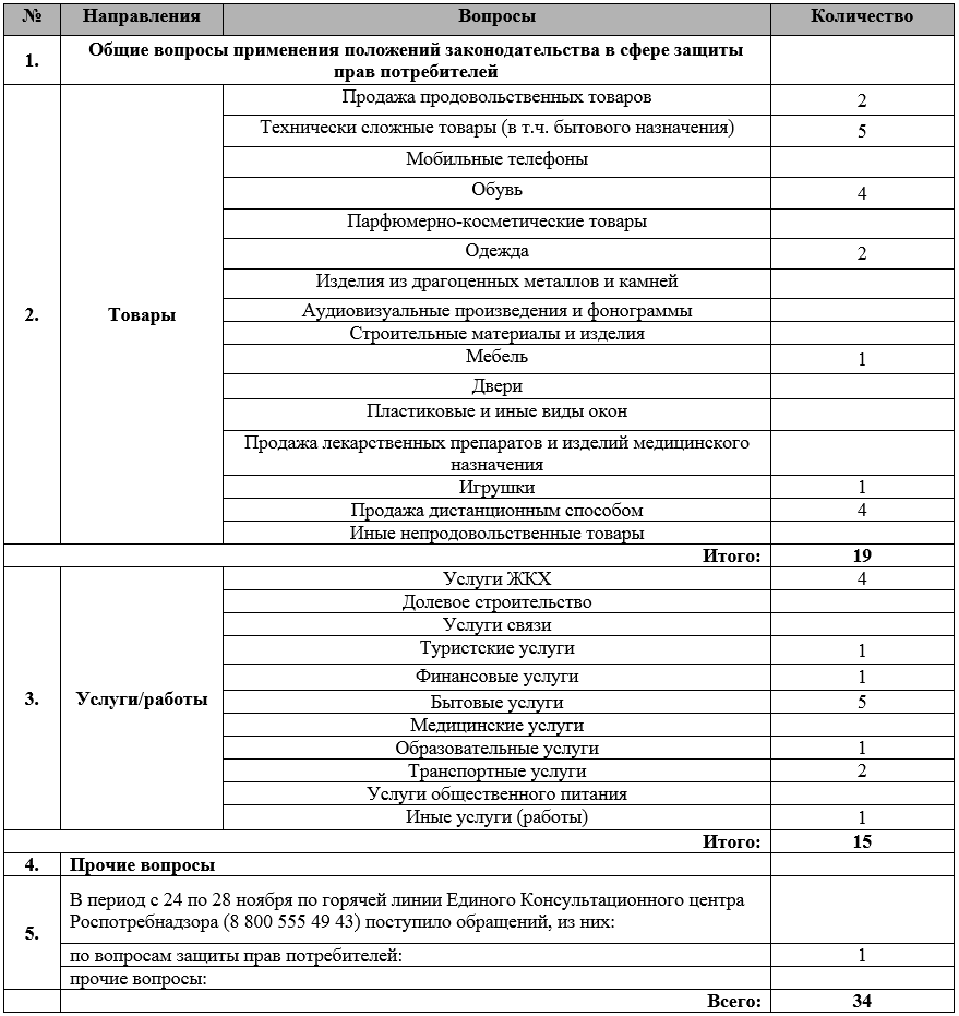 В период с 24 по 28 ноября 2025 года в консультационный центр и консультационные пункты по защите прав потребителей поступило 34 обращения от граждан и хозяйствующих субъектов, в том числе: